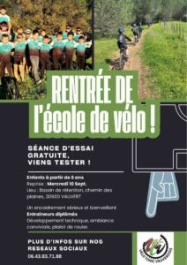 L’école VTT est une structure, un club, qui dispose d’un contenu de formation, d’un moniteur, d’initiateurs, d’animateurs et d’un groupe de jeunes pratiquants le tout rassemblé pour la découverte et la pratique du cyclisme VTT dans le cadre des loisirs et du volontariat.